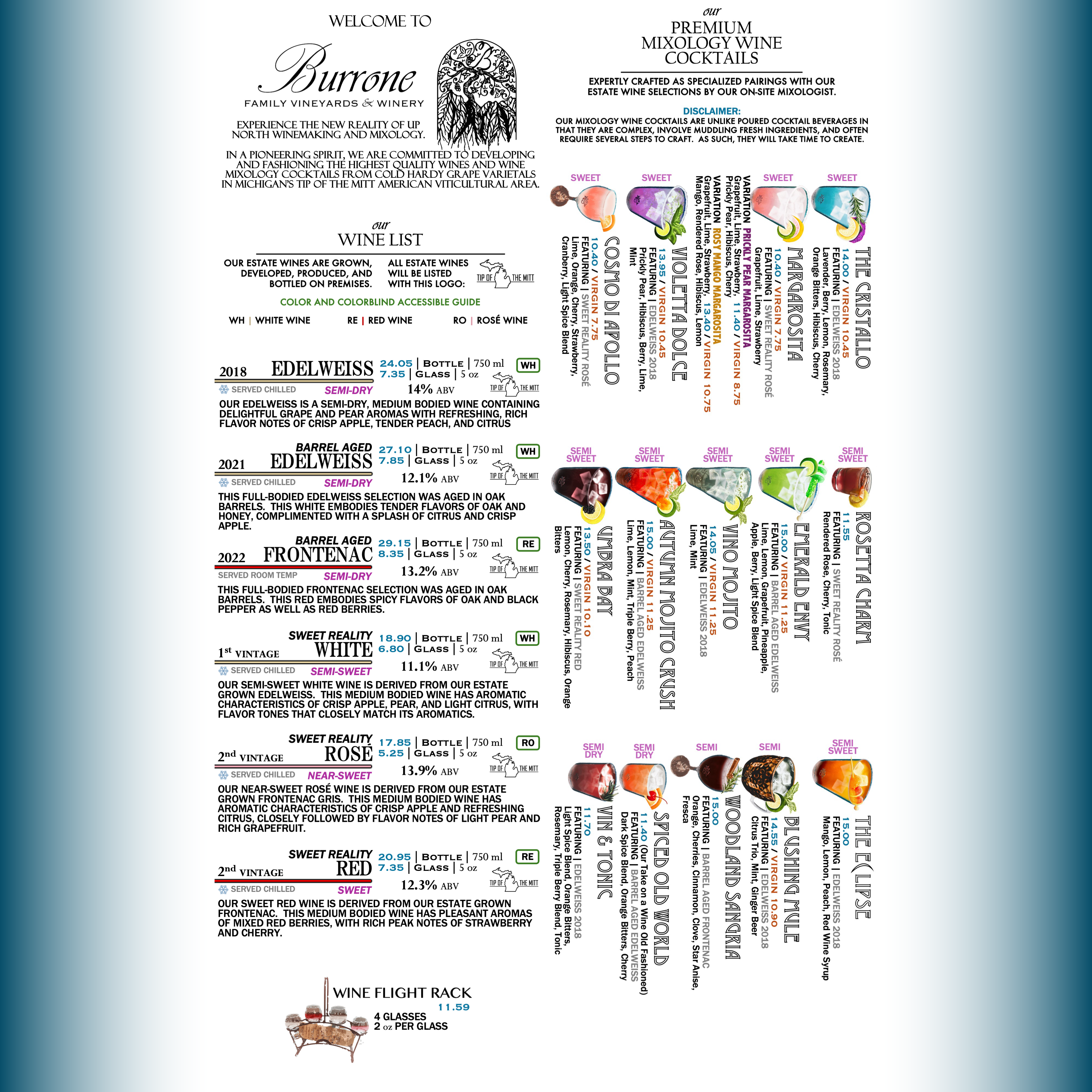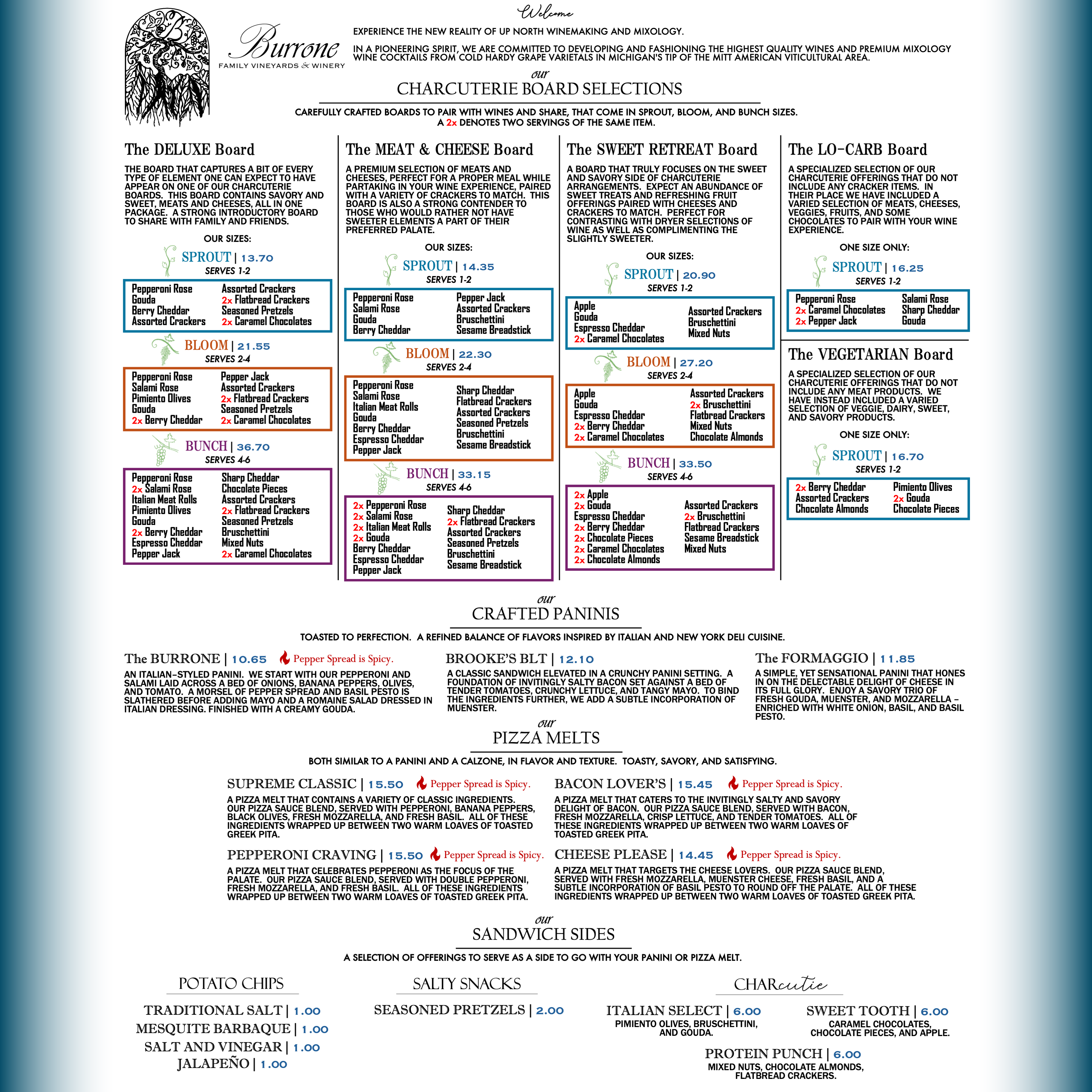 We are a winery that services a restaurant menu catering to wine selections, wine flights, various plentiful charcuterie boards, premium mixology wine cocktails crafted by our on-site experienced mixologist, hot scrumptious panini sandwiches and sides - all to make your Up North Wine Experience that much